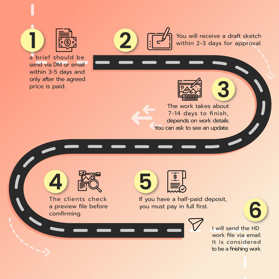 - The commission brief should be sent via DM (X or BlueSky) or email at least 3-5 days. If it exceeds this period, your commission will suspend and start a next queue immediately.Work Process- The clients will receive a draft sketch for approval. Except..